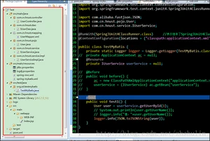 测试类在src/test/java中建立,下面测试类中注释掉的部分是不使用Spring时,一般情况下的一种测试方法;如果使用了Spring那么就可以使用注解的方式来引入配置文件和类,然后再将service接口对象注入,就可以进行测试了。