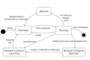 说明:其中 Running 表示运行状态,Runnable 表示就绪状态(万事俱备,只欠CPU),Blocked 表示阻塞状态,阻塞状态又有多种情况,可能是因为调用 wait()方法进入等待池,也可能是执行同步方法或同步代码块进入等锁池,或者是调用了 sleep()方法或 join()方法等待休眠或其他线程结束,或是因为发生了 I/O 中断。