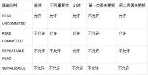 数据并发访问所产生的问题,在有些场景下可能是允许的,但是有些场景下可能就是致命的,数据库通常会通过锁机制来解决数据并发访问问题,按锁定对象不同可以分为表级锁和行级锁;按并发事务锁定关系可以分为共享锁和独占锁,具体的内容大家可以自行查阅资料进行了解。直接使用锁是非常麻烦的,为此数据库为用户提供了自动锁机制,只要用户指定会话的事务隔离级别,数据库就会通过分析 SQL 语句然后为事务访问的资源加上合适的锁,此外,数据库还会维护这些锁通过各种手段提高系统的性能,这些对用户来说都是透明的(就是说你不用理解,事实上我确实也不知道)。ANSI/ISOSQL 92 标准定义了 4 个等级的事务隔离级别,如下表所示: