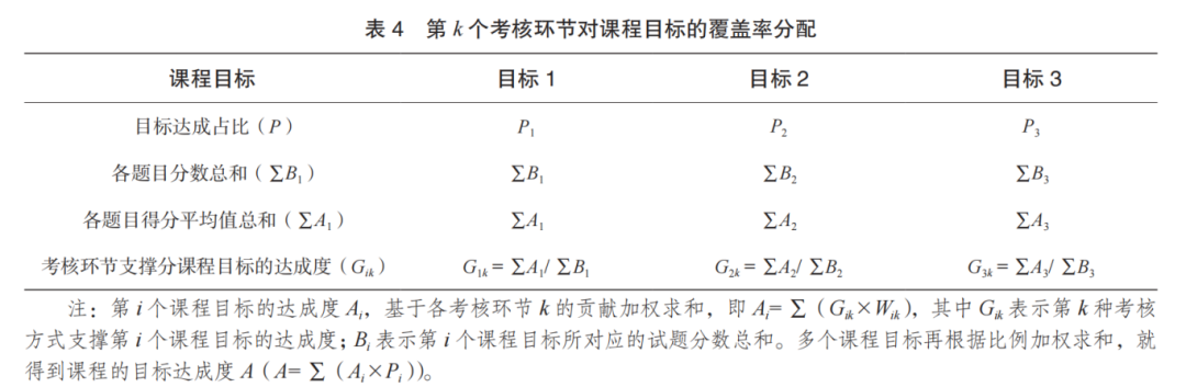各考核环节对各课程目标的覆盖率见表 4 ,计算课程目标的达成度,值大于等于 0.60 表示目标达成。
