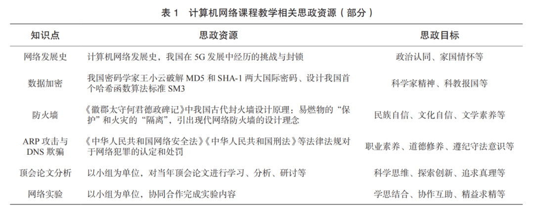 从计算机网络发展史、社会主义核心价值观、法律法规、职业素养、中华优秀传统文化等方面深入挖掘与知识点相关的思政素材,有机融入到教学资料、课程作业、考试题库、授课过程和课程实践等教学各方面、全过程。