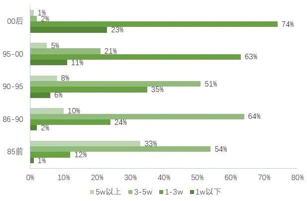 随着工龄的增加,相应的,程序员的薪资也会得到进一步的提高,95年-00年出生的程序员中,21%的程序员月薪冲到3-5万元。而大多晋升到管理层的86-90程序员们,薪资不少已经达到了3-5万元,33%的程序员月薪达到5万元以上。