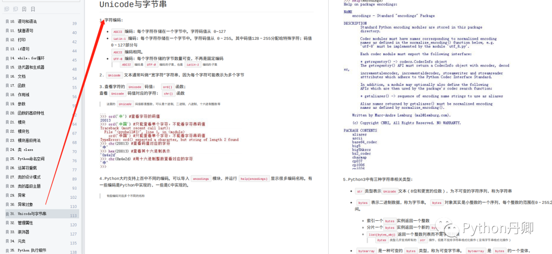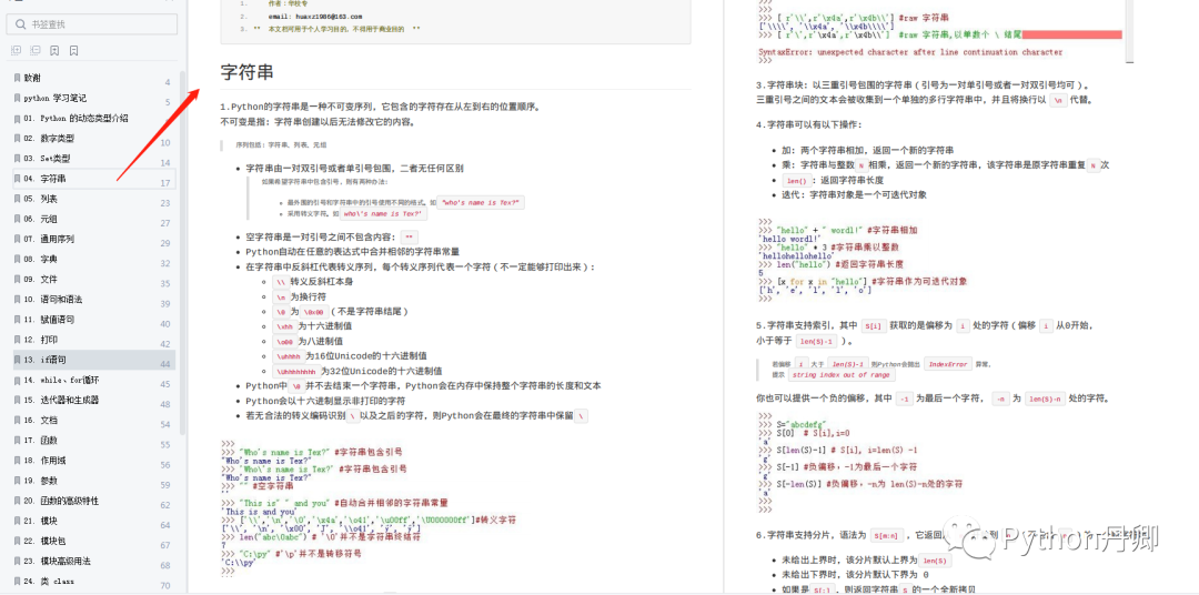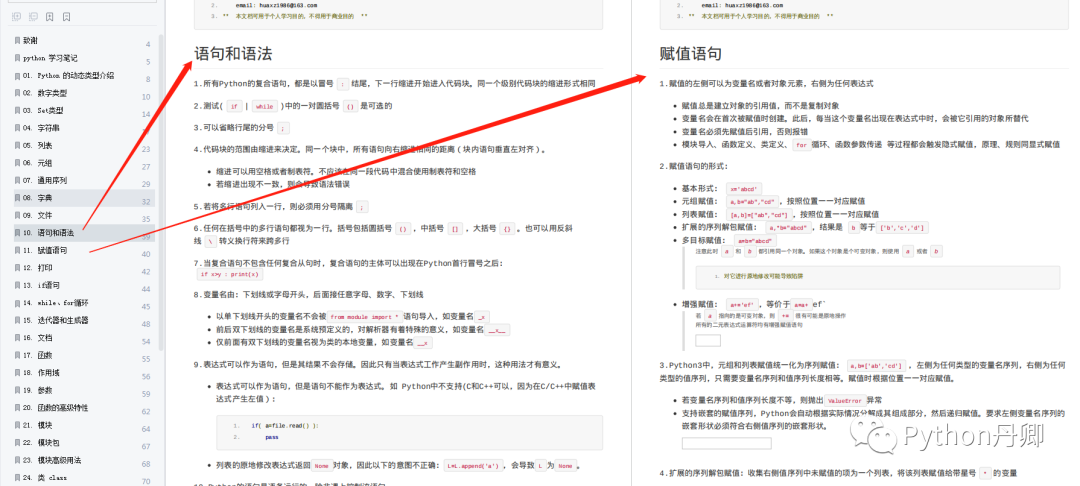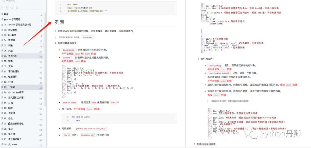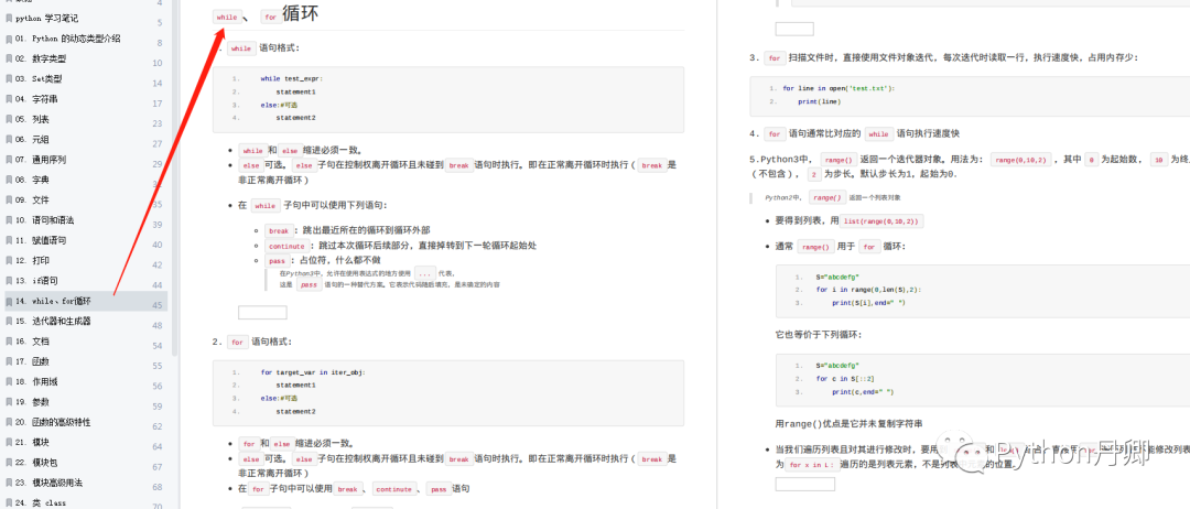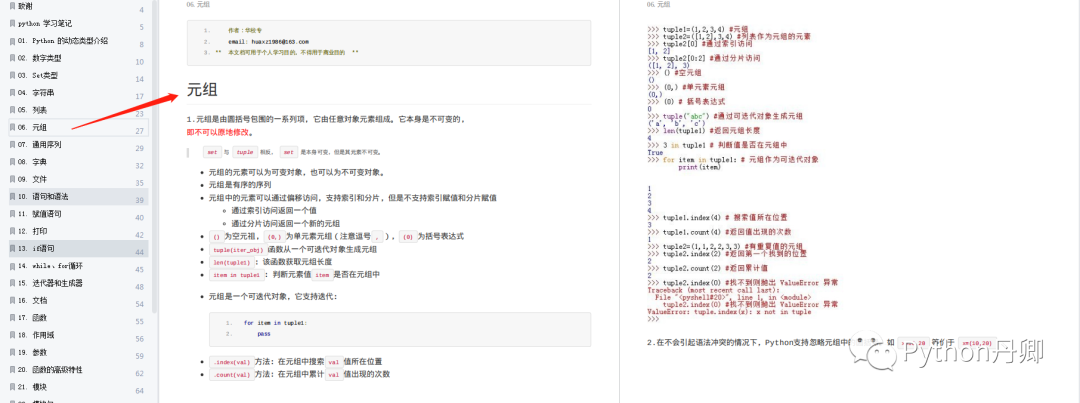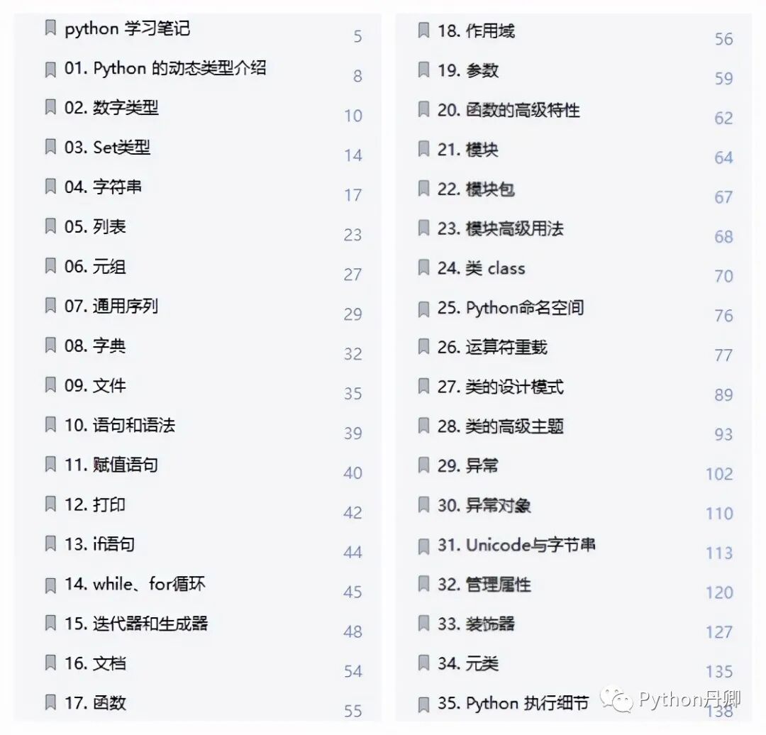 今天给大家分享一份《Python学习笔记》,这份文档包含35个知识点,如:类型、字符串、列表、元组、语句语法、循环、模块等等,笔记将一个知识点的内容都统筹在一个章节里面,因此提炼性大大提高。