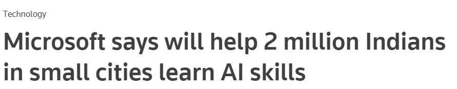 今年2月份,微软CEO Satya Nadella表示将在印度,尤其是二线、三线以及农村地区培训200万人,重点培养20-30岁的年轻人帮助其掌握人工智能相关的技术。