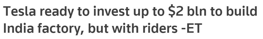 Tesla有计划将投资20亿美元在印度建厂”,有人预测,如果此项计划开始实施,Tesla有可能会进一步压缩美国业务成本,减少美国员工。