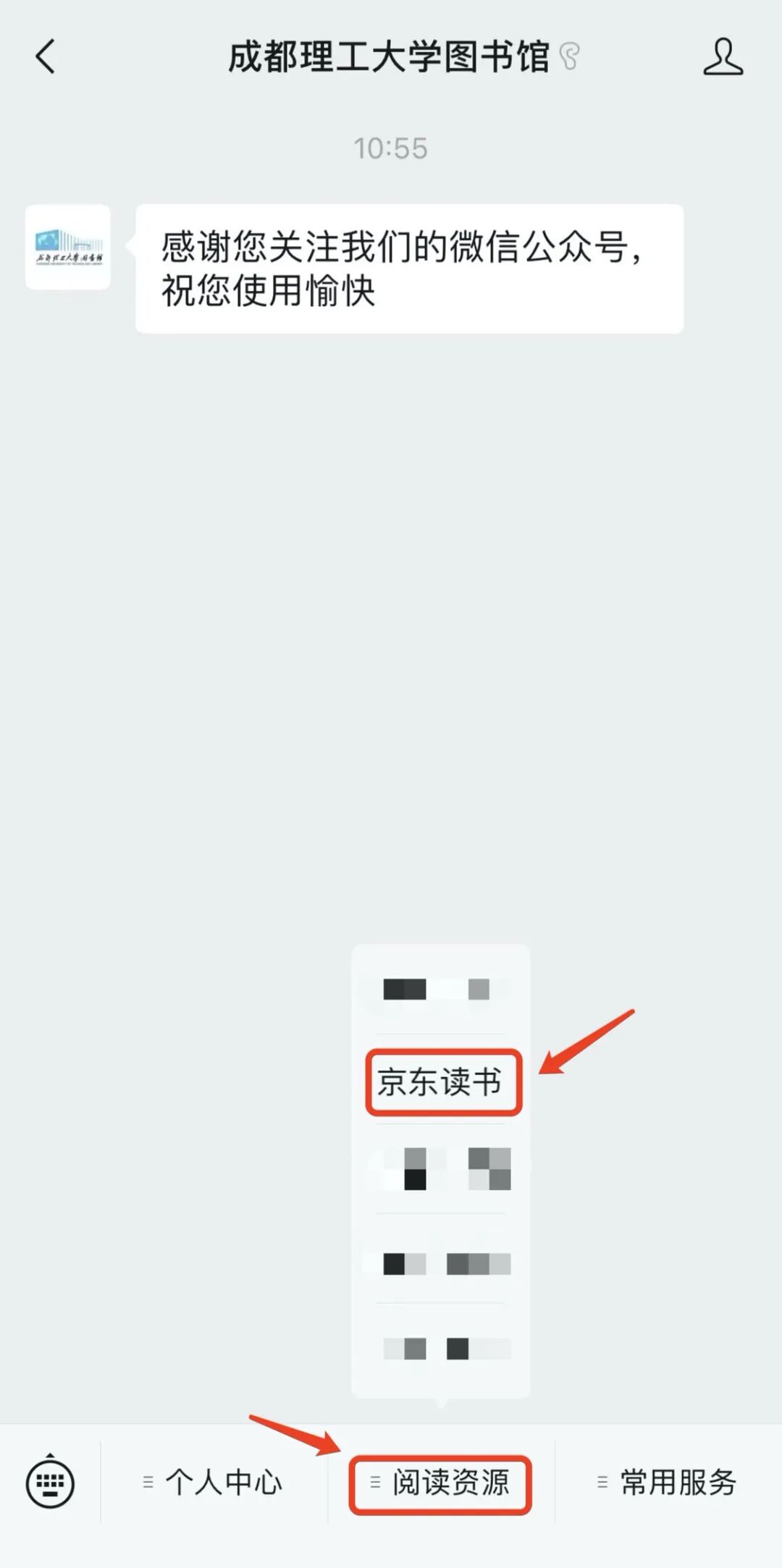 “成都理工大学图书馆”公众号—点击菜单栏中点击“阅读资源”—“京东读书”即可访问。