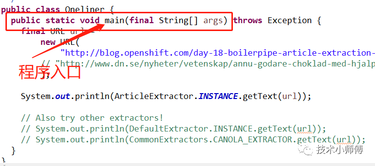 - Java程序入口是一个名为main的public的静态方法,这个方法在你需要运行的类里面定义, 参数是String[]: