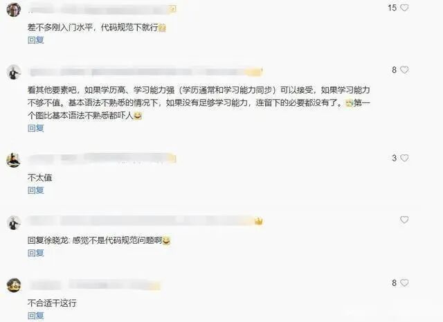 这两张代码图也引发了很多人围观和讨论:有的网友说8k不太值;也有人说差不多是刚入门的水平,注意下代码规范就行;还有人说如果学习能力强可以接受,会考虑留下。