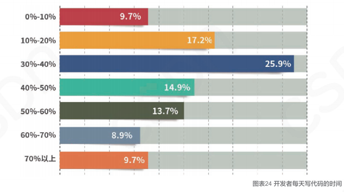 一份报告中显示,在工作中,仅不足 10% 的开发者,每天有超过 70% 以上的时间在写代码,大部分开发者每天仅有 30%-40% 的时间写代码。
