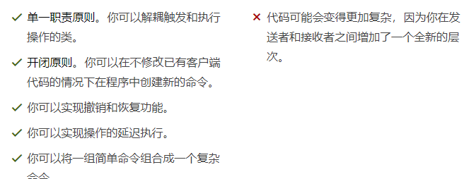 下面是命令模式的优缺点,总结一下,命令模式最大的优点在于:类间解耦,调用者和接收者没有直接耦合,调用者只需调用Command的方法执行接收者的业务逻辑;可扩展性,如果Command需要扩展,很容易实现,新建一个新的子类即可。