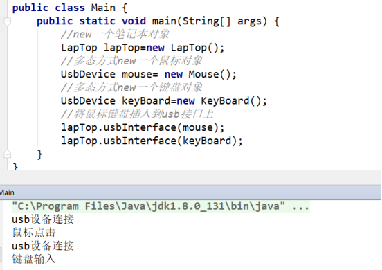 public class Main { public static void main(String[] args) { //new一个笔记本对象 LapTop lapTop=new LapTop(); //多态方式new一个鼠标对象 UsbDevice mouse= new Mouse(); //多态方式new一个键盘对象 UsbDevice keyBoard=new KeyBoard(); //将鼠标键盘插入到usb接口上 lapTop.usbInterface(mouse); lapTop.usbInterface(keyBoard); } } |