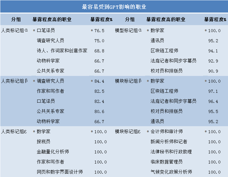从整体趋势上看,与普遍的认知恰恰相反,高学历、高收入的白领工作受到的暴露率更高。暴露率较高的职业有报税员、口译员和笔译员、调查研究人员、校对和抄写员、作家。其中,暴露率达到100%的工作包括数学家、报税员、量化金融分析师、作家、网络和数字界面设计师、区块链工程师。