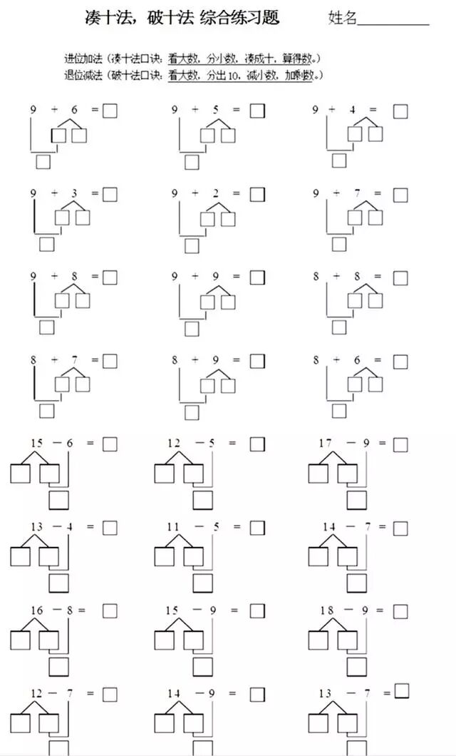 2、凑十法简便易行,思考过程有“一看(看大数),二拆(拆小数),三凑十,四连加”。