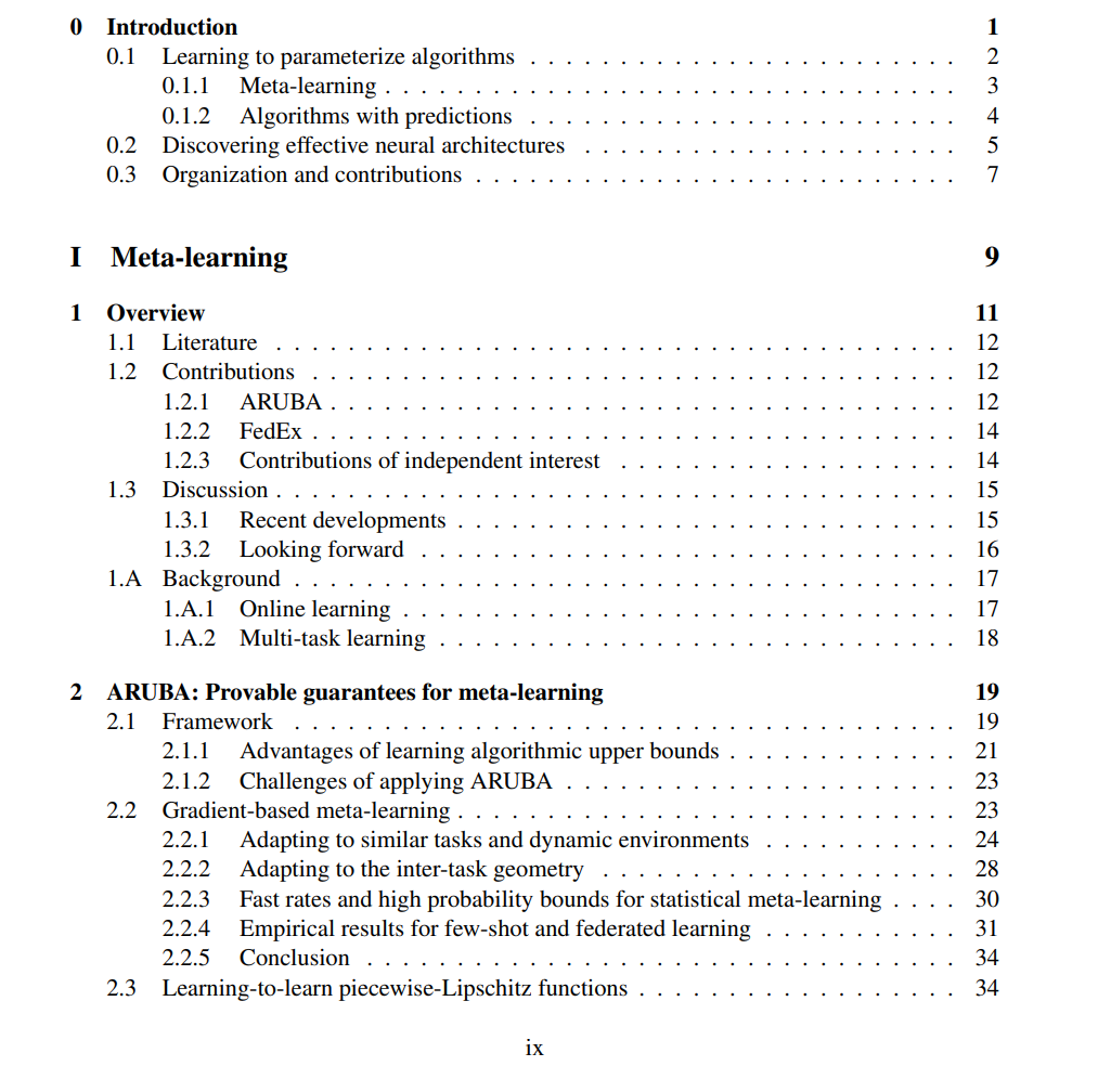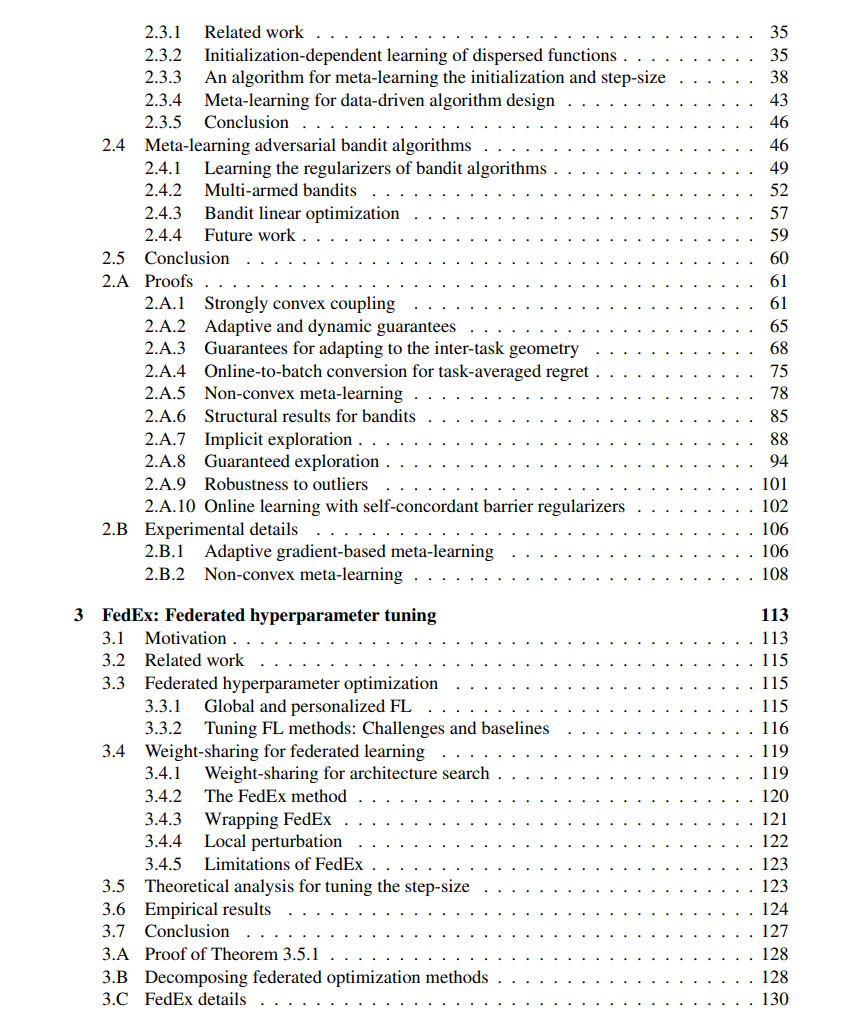 在元学习中,我们利用机器学习自身来改善 ML 算法,通过跨多个学习任务进行学习,我们引入了 ARUBA,一个用于设计和分析元学习方法的框架。我们的分析提供了基于梯度的元学习的首次保证,展示了这些方法如何根据可量化的学习任务相似性指标提高性能。我们利用 ARUBA 将元学习的实际影响扩展到机器学习的新领域,包括部分反馈学习和联邦学习;在后者中,我们引入了 FedEx,一种用于调优联邦优化器的新型最先进方法,该优化器在分布式异构数据集(如移动设备和医院记录)网络上训练模型。