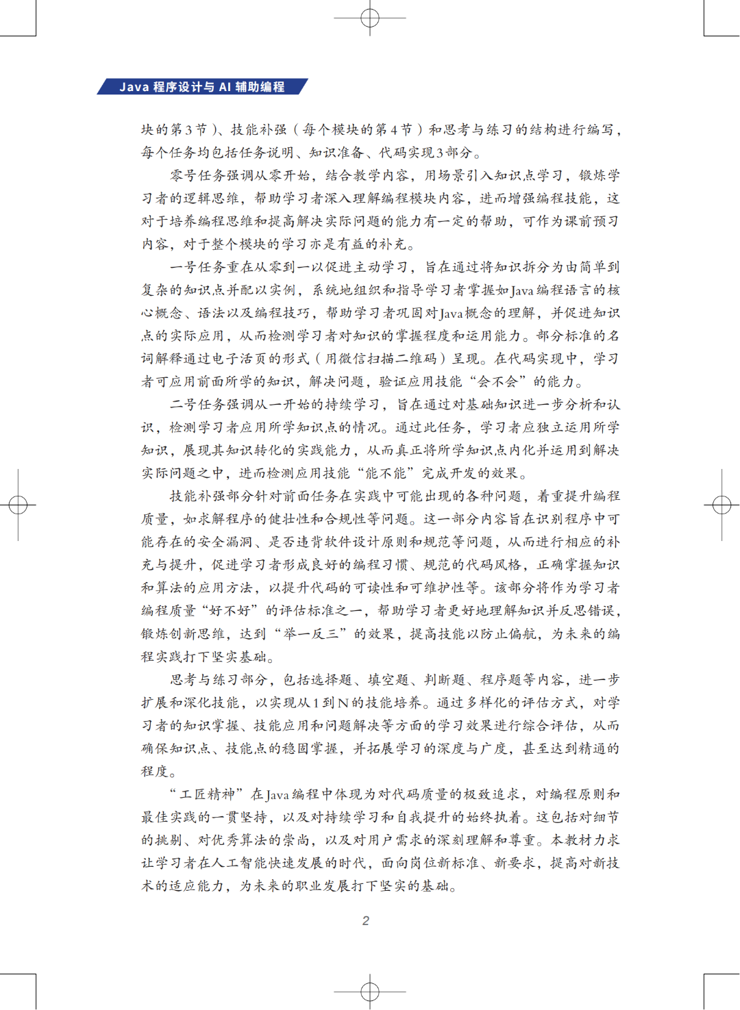 本教材在以任务为线索介绍编程知识与技能的同时,不仅介绍知识和技能的应用,还结合生产一线的要求,重在提高学习者对知识和技能的理解运用能力。当前大多数教材主要关注知识运用“会不会”、技能掌握“能不能”这两个要求,锻炼学生参照模板完成任务的能力。而伴随大模型的出现,AI编程助手已可以按模板完成代码生成工作。因此,本教材在编写中面向理解编程语法、数据结构、算法以及软件设计原则等核心能力,强调编程质量“好不好”的技能培养,让学习者更好地提升编程的技术与技能,在基础阶段就培养其逻辑思维和解决问题的能力。