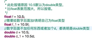 3.float f = 10.5;会报错,因为Java中,默认小数为double类型,double类型的表数范围比float大,所以报错。正确写法为float f = 10.5f; 数字后面的f表明该小数位float类型。如果是double类型可以写成 double d = 10.5;或者double d = 10.5d;都可以。