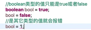 5.布尔类型的值只能是true或者false,不能是其它内容,例如,boolean b = true; boolean b_1 = false;如果给其它值会报错。